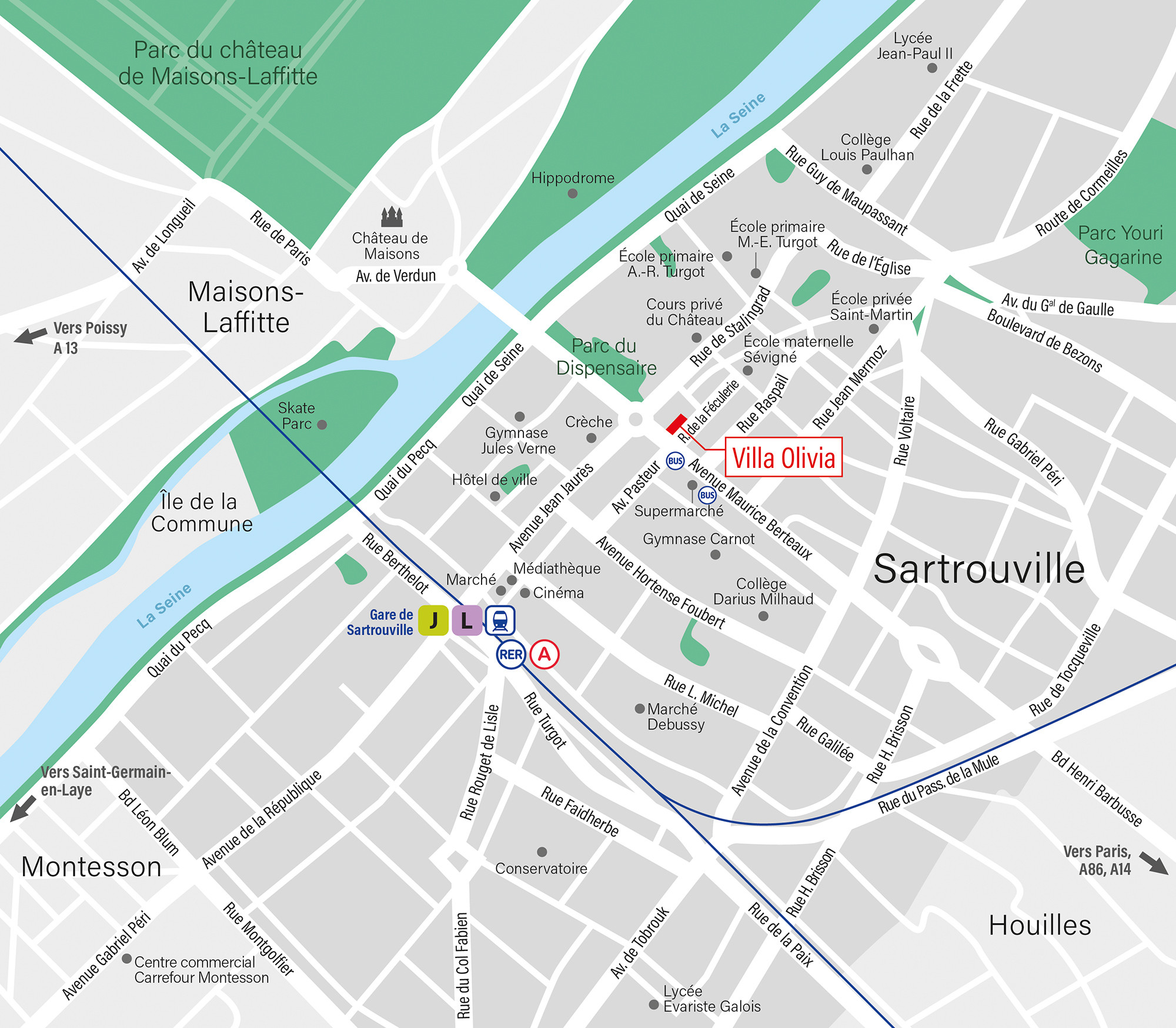 À seulement 750 mètres de la gare (RER A et lignes J et L), La Défense se rejoint en 12 minutes* et Paris–Saint-Lazare en 25 minutes* garantissant une accessibilité privilégiée. Face au parc du Dispensaire et des berges de Seine, tout concourt à un cadre de vie durable et recherché.